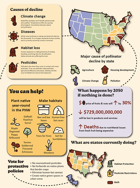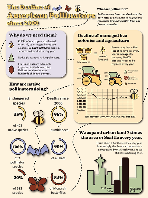 This infographic's 'wicked problem ' is the population decline of pollinators. My goal was to grab the audience's attention with bright, playful colors, but lead them on the sadder journey of how and why pollinators are dying, and what common people can do to help. This is a really important problem to solve because we rely on pollinators for the production of 87% of our crop-related food.